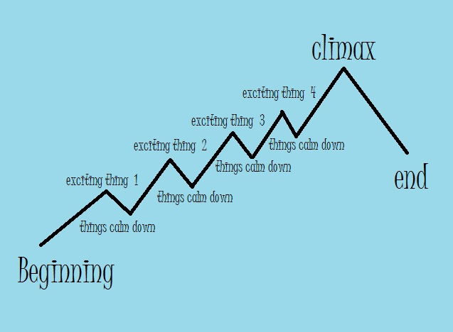 A typical plot is a bit like a mountain. You start out at the foot of the mountain, then something happens and you move higher. Then something even more exciting happens, and you move higher yet. Then the most exciting thing happens, which is like reaching the top of the mountain. And then you see how all that has affected the characters and where they are in their lives after the excitement, which is like strolling down the other side.
