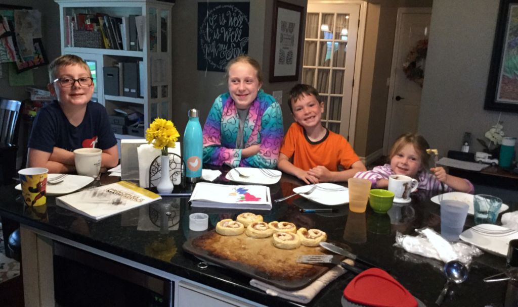 Our days start later lately as my children have grown older. I am a night owl and rarely am asleep before midnight. I spent so many years up in the night with babies and toddlers that sometimes I think I am still trying to get sleep that I missed for all those years! At least one of the children is up before me and things have been even more unusual now that my husband is working from home. I used to get woken up by my youngest child, but now I often wake on my own. During school, we aim to be at the kitchen island around 9 to start our Morning Time. By around 9:15 everyone has breakfast (or 2nd breakfast) before them and I get started.